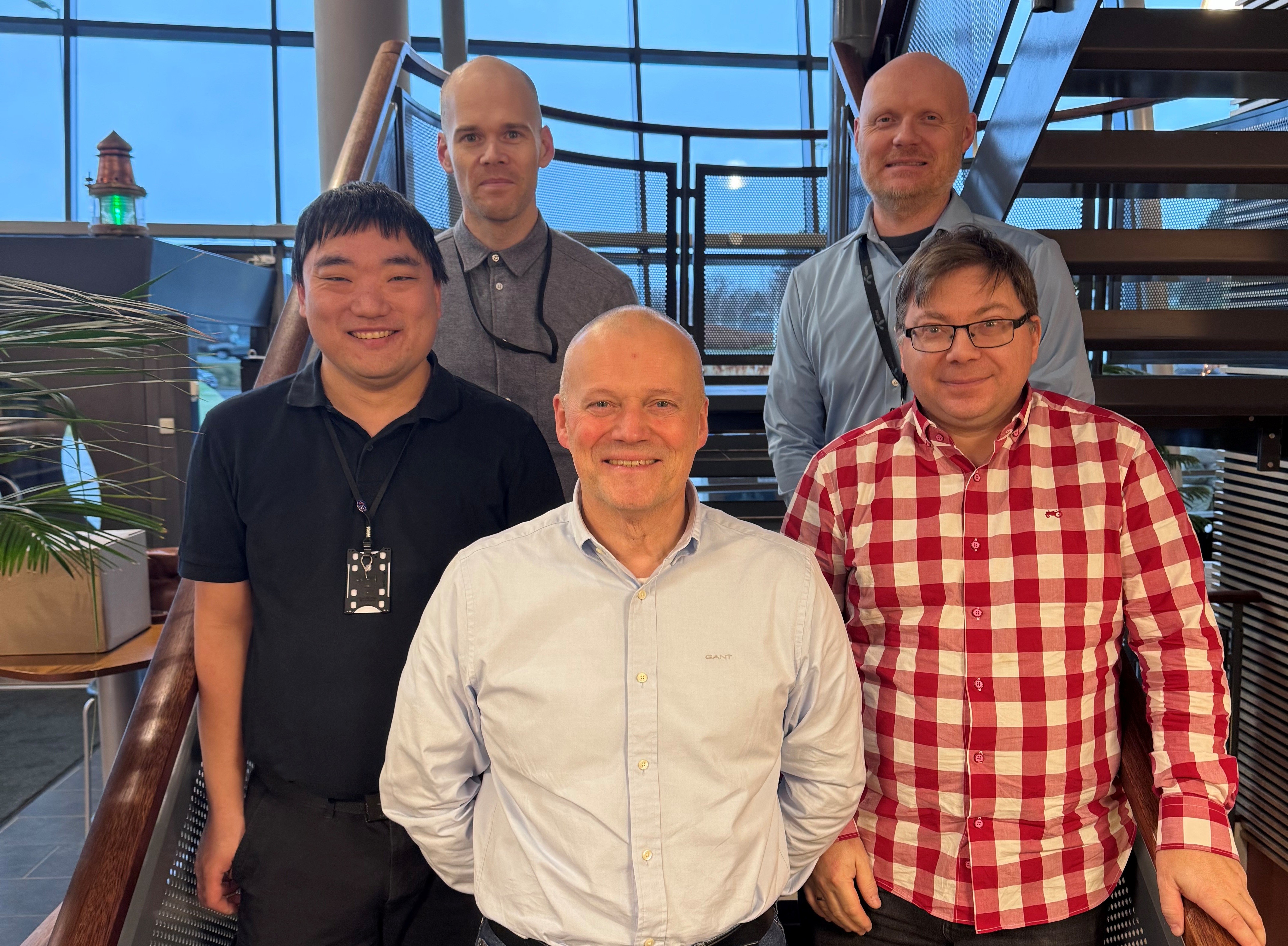 Fra venstre: Eirik Vestbø Rasmussen, Christian Ladstein Sørbø (bak), Erling Holmslet (leder) Håvard Wasbø (bak) og Trond Sommerstad. (Foto: Hovedredningssentralen, Anja Bakken)