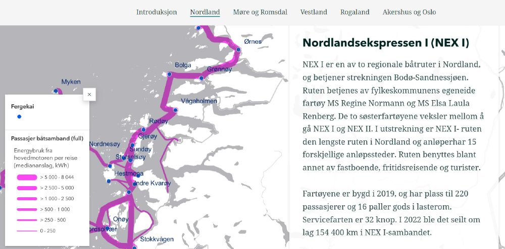 Basert på data frå TØIs utsleppsmodell har Kystverket utvikla ei visuell framstilling av passasjerbåtrutene, traseane, utsleppa og energibehovet. Denne nettsida inneheld òg fylka sin omtale av passasjerbåttilbodet og planane deira for utsleppa. I tillegg har Kystverket laga ei stilisert nasjonal framstilling av båtrutene og passasjertalet basert på data frå Statistisk sentralbyrå i eit høyringsnotat frå 2021 (Kommunal- og moderniseringsdepartementet (2021): «Forslag til endringer i båt- og ferjenøkkelen i inntektssystemet for fylkeskommunene. Høringsnotat»). Dei to neste figurane er henta frå Kystverkets kartverktøy.