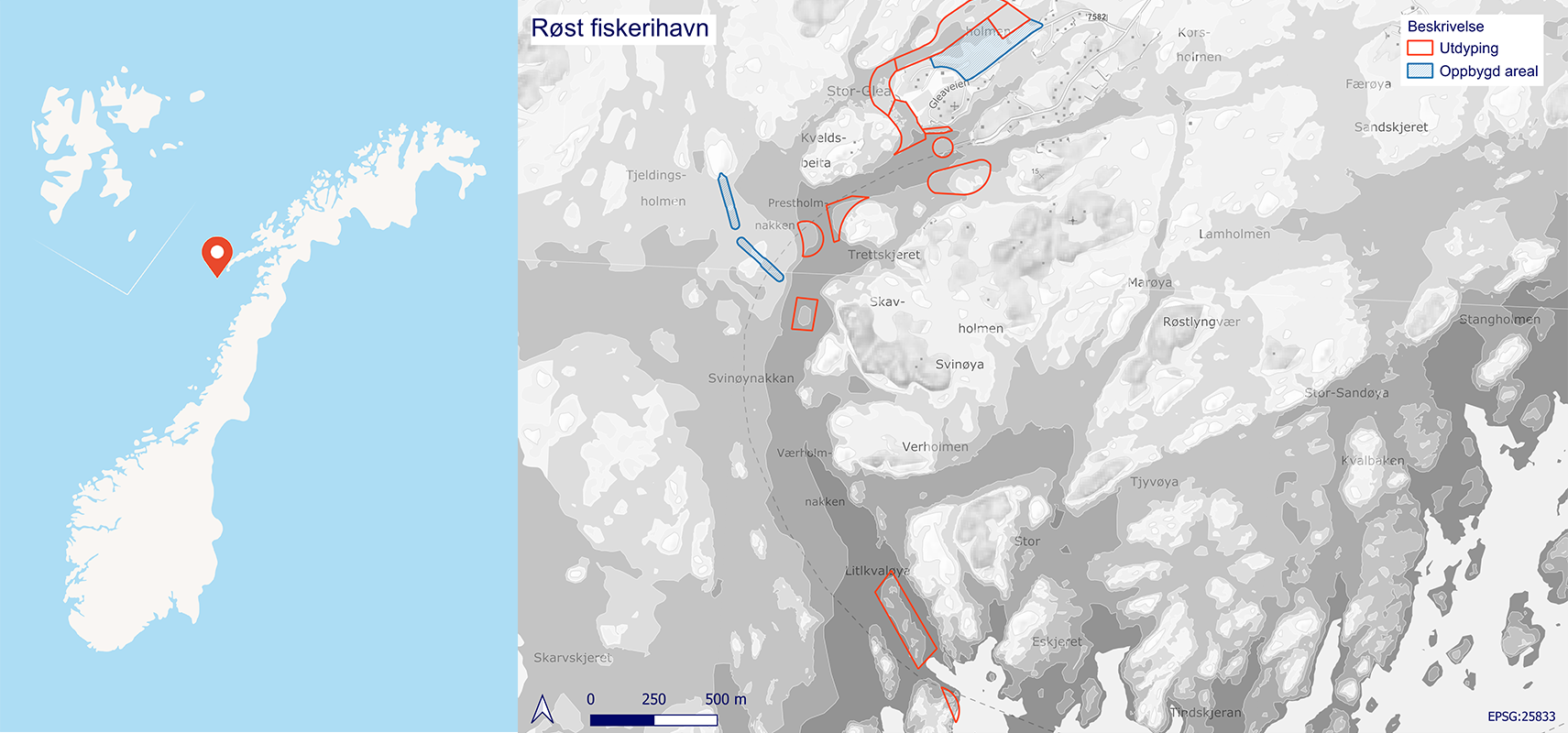 - Overskuddsmasser skal brukes i molo eller losses på land og deponeres. Øvrige overskuddsmasser skal mellomlagres på opparbeidet deponi ved Glea og overdras til Røst kommune