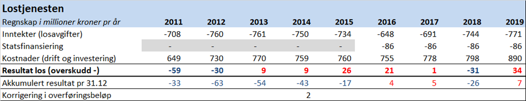 Last ned Regnskap 2011-2019Utvikling i lostjenestens resultat i perioden 2011-2019.