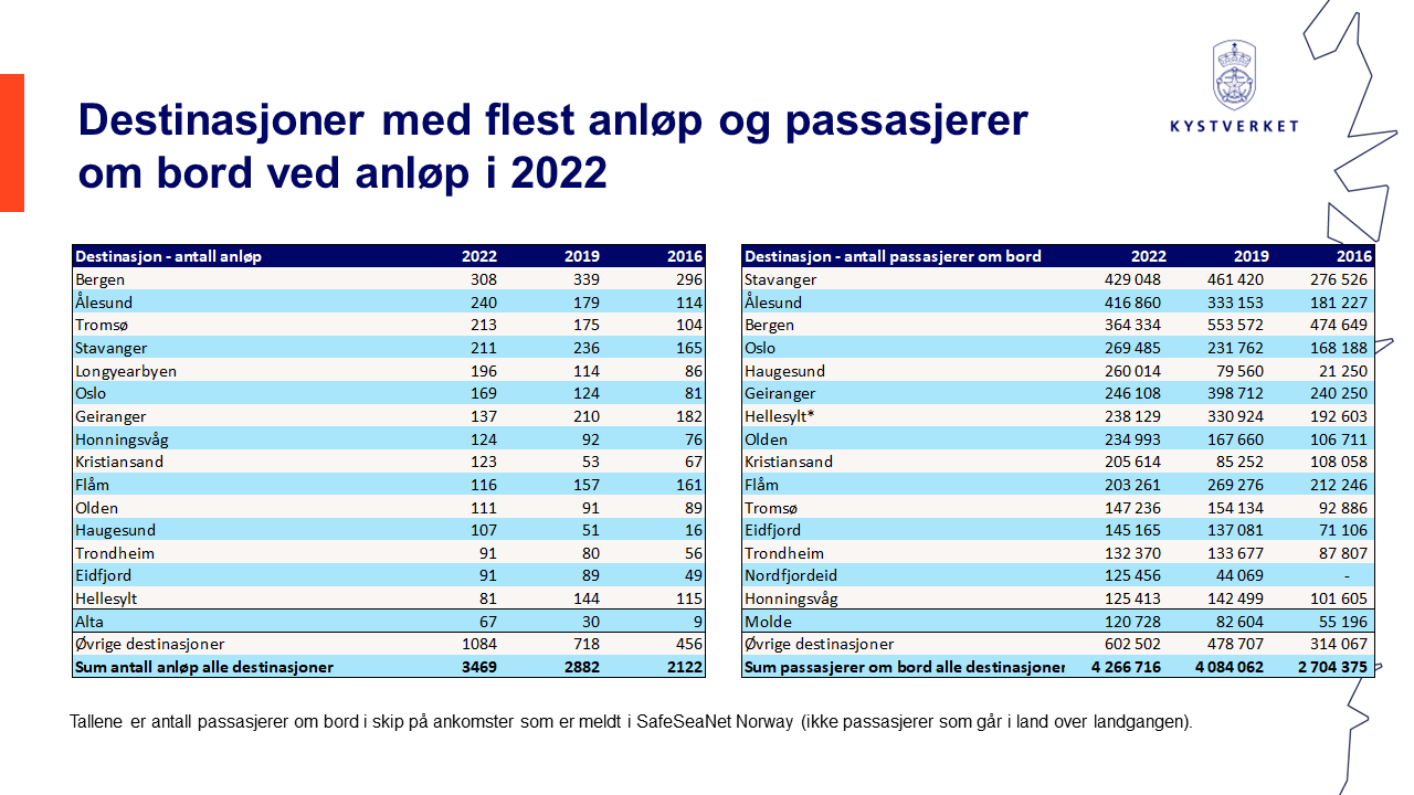 Last ned Destinasjoner med flest cruiseanløp og passasjerer i 2022Destinasjoner i Norge med flest cruiseanløp og passasjerer i 2022.