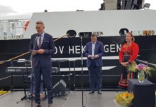 Kystdirektør Einar Vik Arset taler under dåpen av OV Hekkingen. Bak står avdelingsdirektør for rederi, fyr og sjømerking i Kystverket, Trond Røren, og gudmor Elisabeth Aarsæther, direktør i DSB.