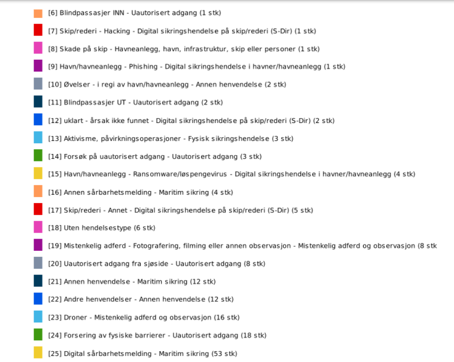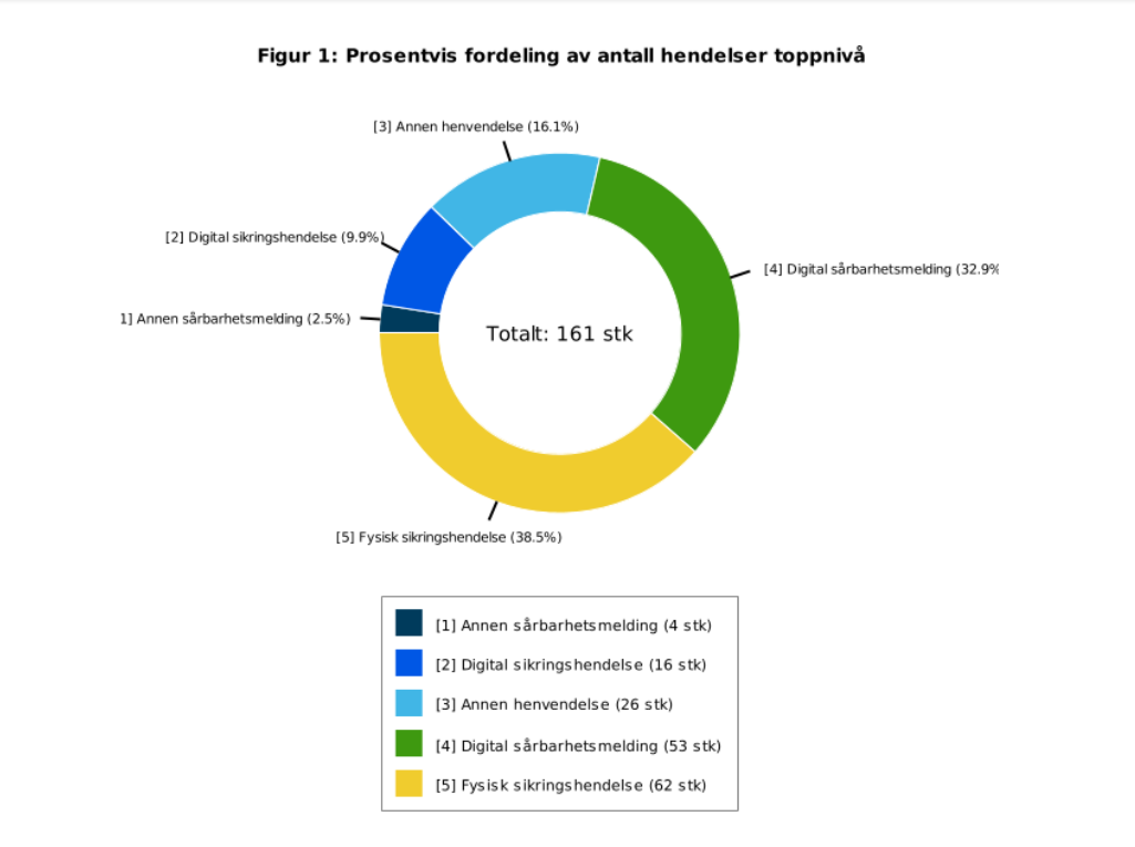 Fysiske sikringshendelser utgjør den største andelen med 38,5 prosent. Dette omfatter blant annet forsøk på uautorisert adgang, forsering av barrierer og hendelser fra sjøsiden. Slike forhold knytter seg til grunnleggende sikring, og viser at dette fortsatt må følges opp systematisk.