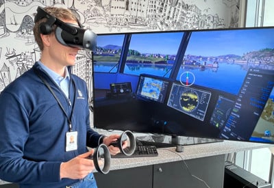 Kystverkets digitale tvilling er en virtuell kopi av kystlinjen. Simulatorverktøyet er basert på VR-teknologi (virtual reality), og ble utviklet under pandemien for å støtte lostjenesten under øving av krevende oppdrag i forkant av seilaser. Verktøyet har i etterkant også vist seg å ha allsidig nytte for andre fagmiljøer i Kystverket, deriblant til uttesting av ulike maritime tjenester.