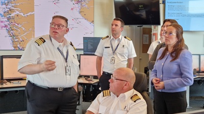 Der fikk statsråden og hennes følge omvisning i operasjonsrommet der to maritime trafikkledere til enhver tid er på vakt, overvåker og kontrollerer sjøtrafikken i norske kyst- og havområder. De fikk også en orientering om ansvar og oppgaver som sjøtrafikksentralen håndterer på vegne av Kystverket og NFD.