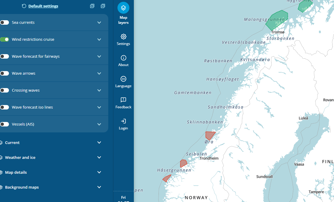 Velg temalaget «Forbudsområde for passasjerfartøy over 150 meter ved sterk kuling».