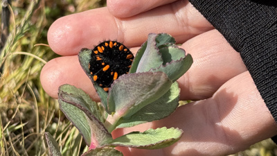 Siv fra Kystverket setter forsiktige ut en av de sjeldne apollolarvene. Denne skal vokse seg stor og bli til en av våre største og vakreste sommerfugler. Foto: Rolf Jørn Fjærbu / Kystverket