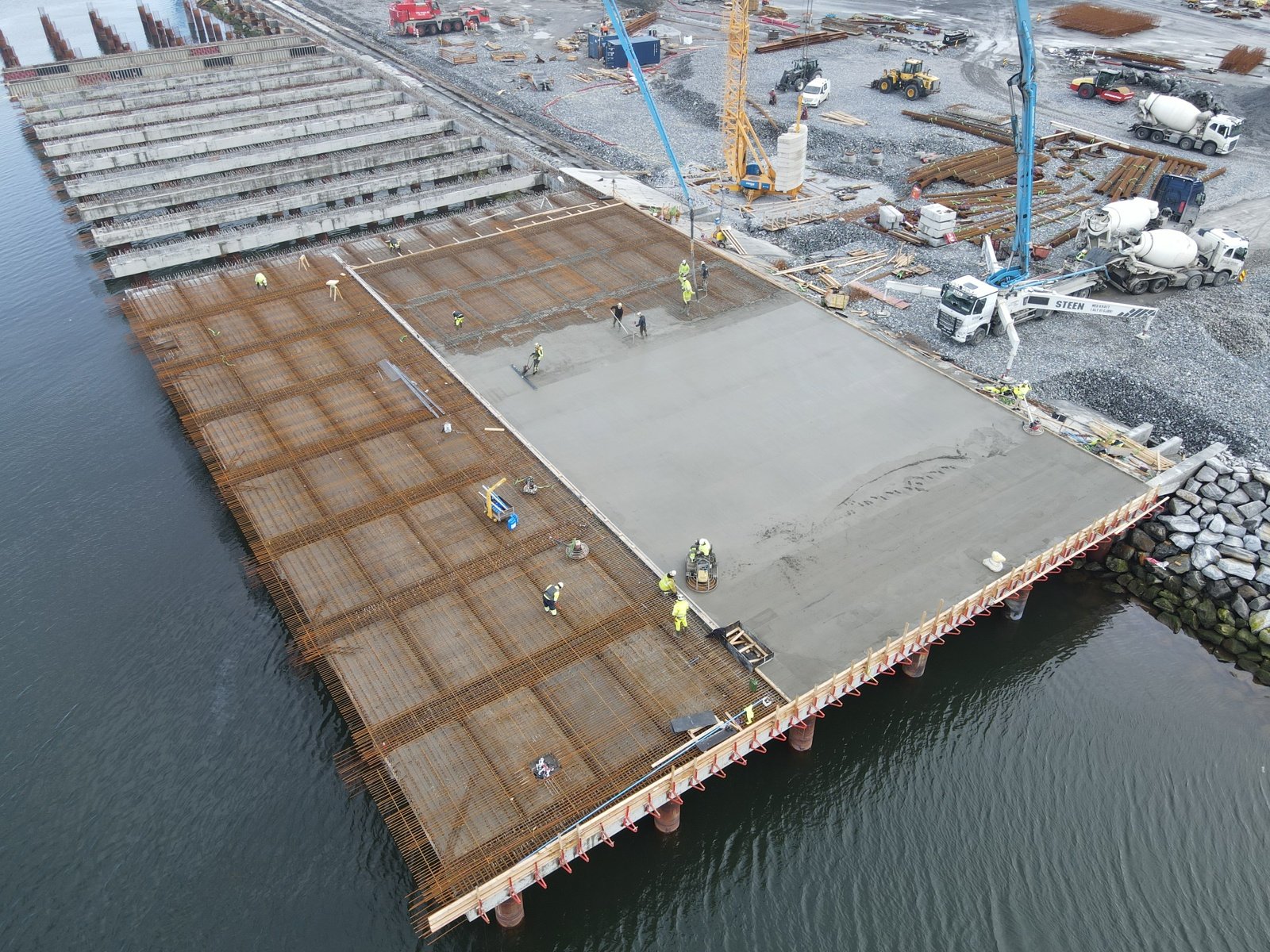Det er stor aktivitet på Langneset, og dypvannskaia vokser nå tydelig frem. I dag gjennomføres den største betongstøpen så langt, hvor rundt en tredjedel av kaidekket støpes.