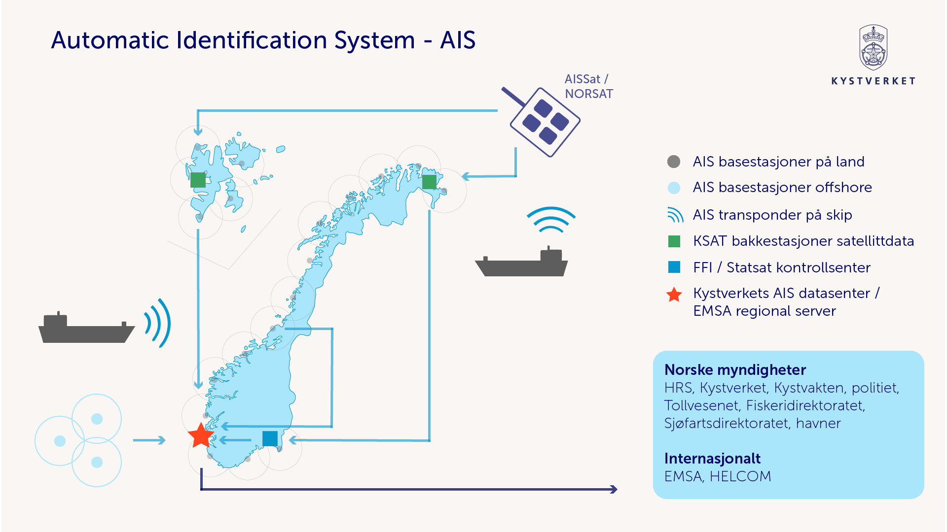 Last ned AIS-illustrasjonDet nasjonale AIS-nettverket AIS Norge består av landbasert og satellittbasert AIS, og er driftet av Kystverket. AIS Norge registrerer daglig AIS-signaler fra flere tusen fartøy. Disse gjøres tilgjengelig for andre myndigheter. Historiske AIS-data er søkbare i Kystverkets datavaresenter, kystdatahuset.no.