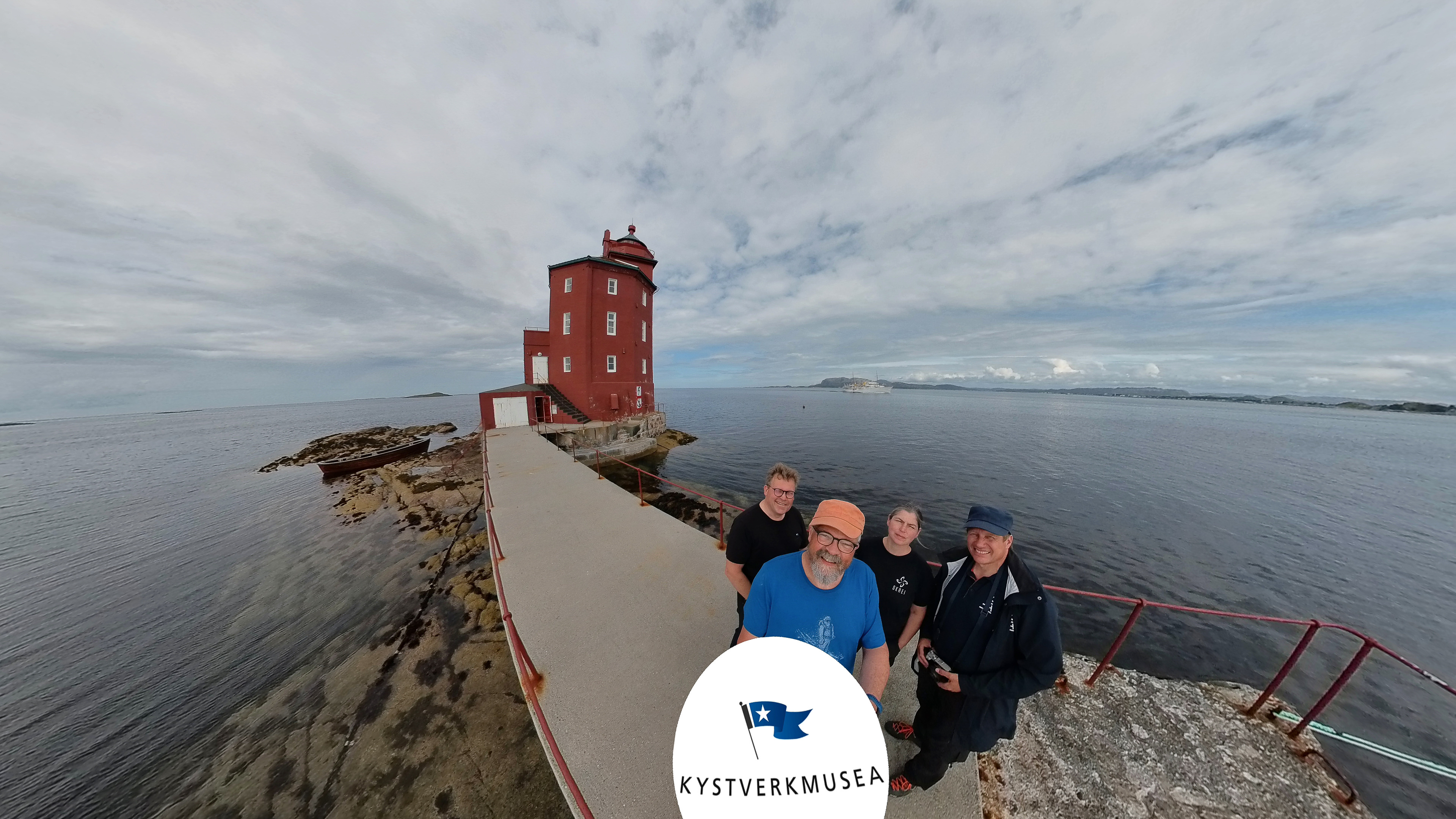 Last ned Kjeungskjær_20240727_logo_492-2.jpgArbeidslaget fra Kystverkmusea på Kjeungskjær fyr i forbindelse med dokumentasjonsarbeidet som er grunnlaget for de digitale fyrversjonene på fyr.kystverket.no. Og i bakgrunnen seiler Kongeskipet Norge forbi. Fra venstre Espen Frøysland, Simen Lunøe Pihl, Kristine Moltu og Frode Pilskog.