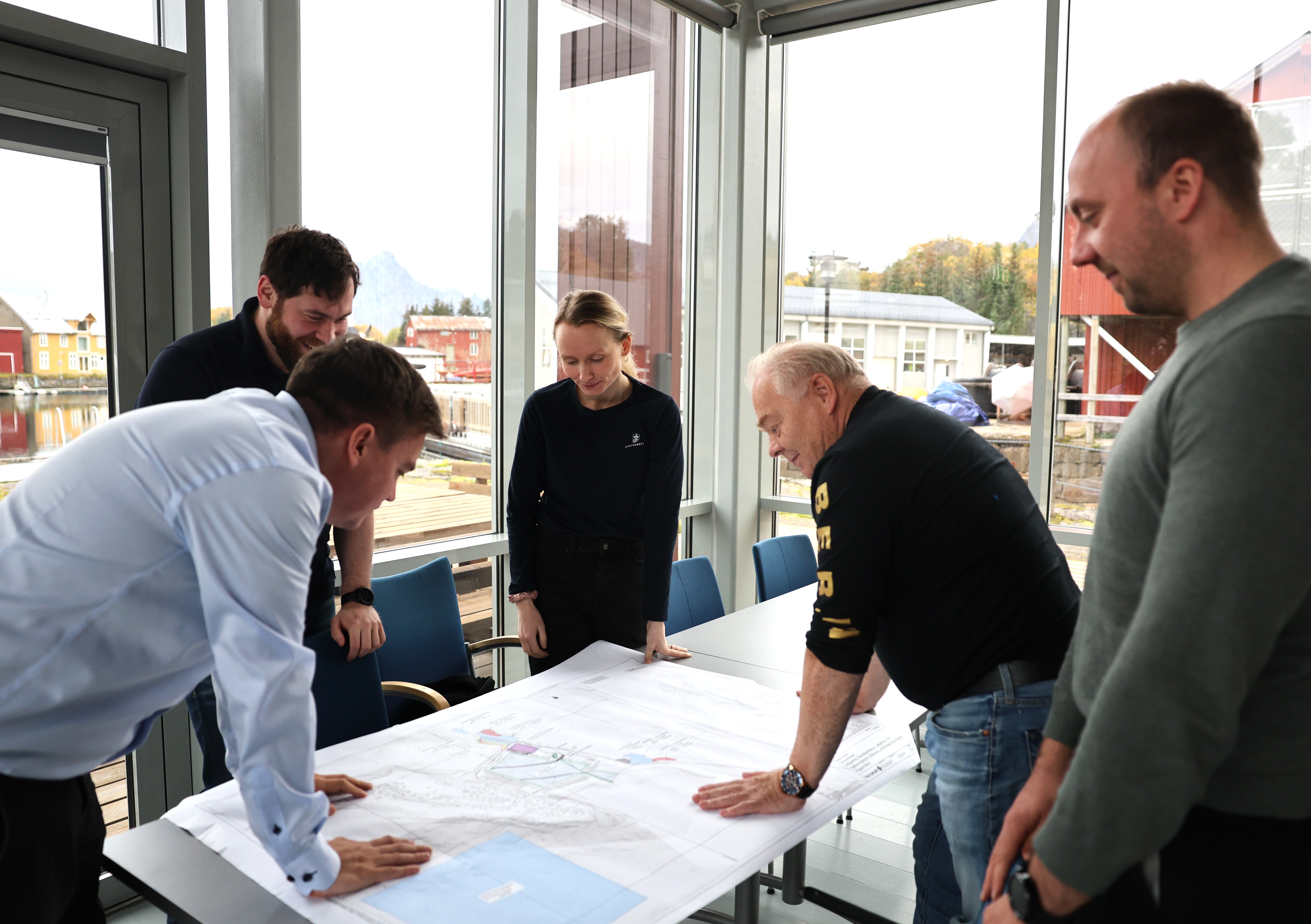 Last ned Gjennomgang_fotoKystverket.JPGUnder kontraktsmøtet ble tiltakene for Husøy fiskerihavn gjennomgått. Prosjektet skal legge til rette for tryggere innseiling og økt aktivitet i fiskerisamfunnet Husøy. Fra venstre: Magnus Rørvik (Kystverket), Ole-Irgen Hammer (Kystverket), Frida Grønhaug Ottemo (Kystverket), Morten Jørgensen (Norvald Jørgensen), Raymond Richardsen (Norvald Jørgensen).
