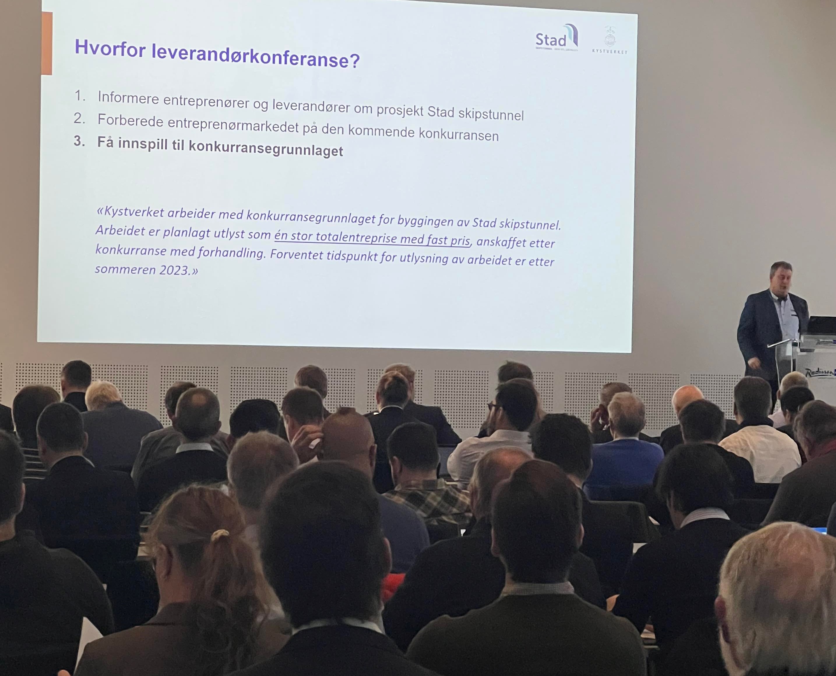 Prosjektleder for Stad skipstunnel, Terje Skjeppestad, foran rundt 160 deltagere på Kystverkets leverandørkonferanse.