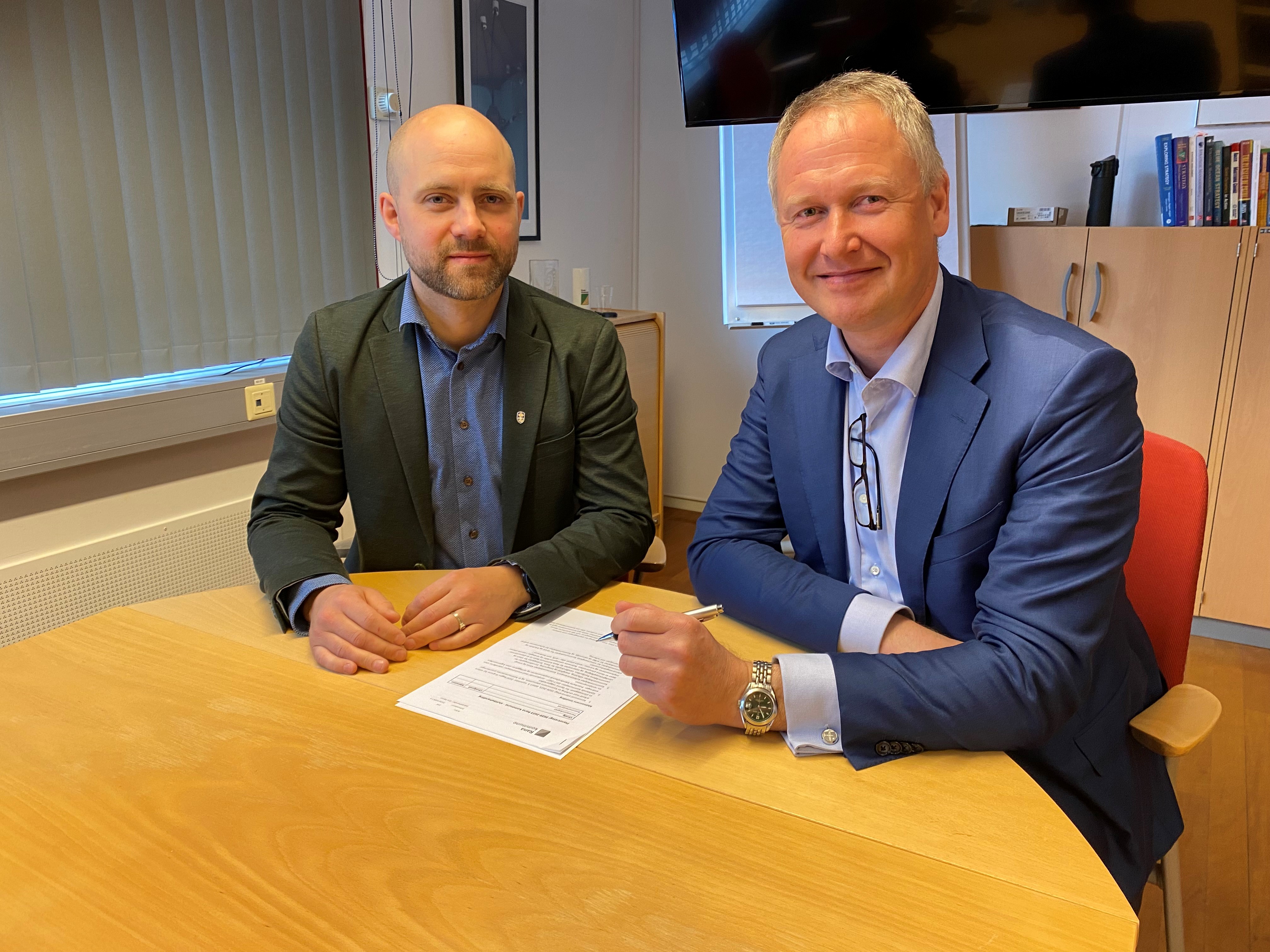 Jostein Moe (t.v.), leder for Kystverkets utbyggingsavdeling, og rådmann Robert Pettersen i Rana kommune har signert samarbeidsavtalen for Innseiling Mo i Rana-prosjektet.