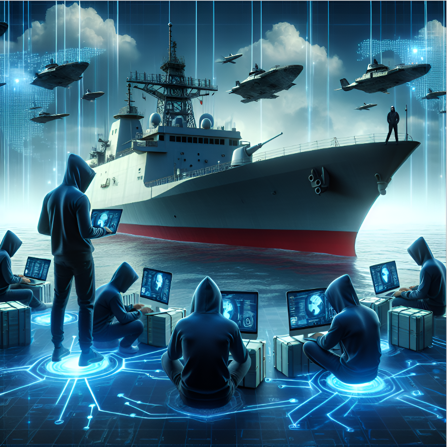 KI-generert illustrasjon. Bildet viser et eksempel på abstrakt oppfatning om cybertrussel-landskapet, laget av Kystverkets KI (KystKI). Søkeord: en illustrasjon av et moderne skip som forsvares mot digitale trusler av mennesker med hettegenser.