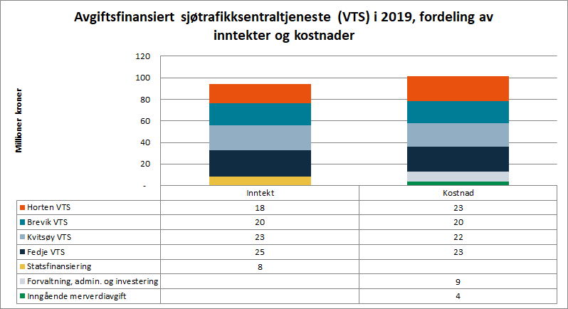 Fordeling av inntekter og kostnader innen VTS i 2019.