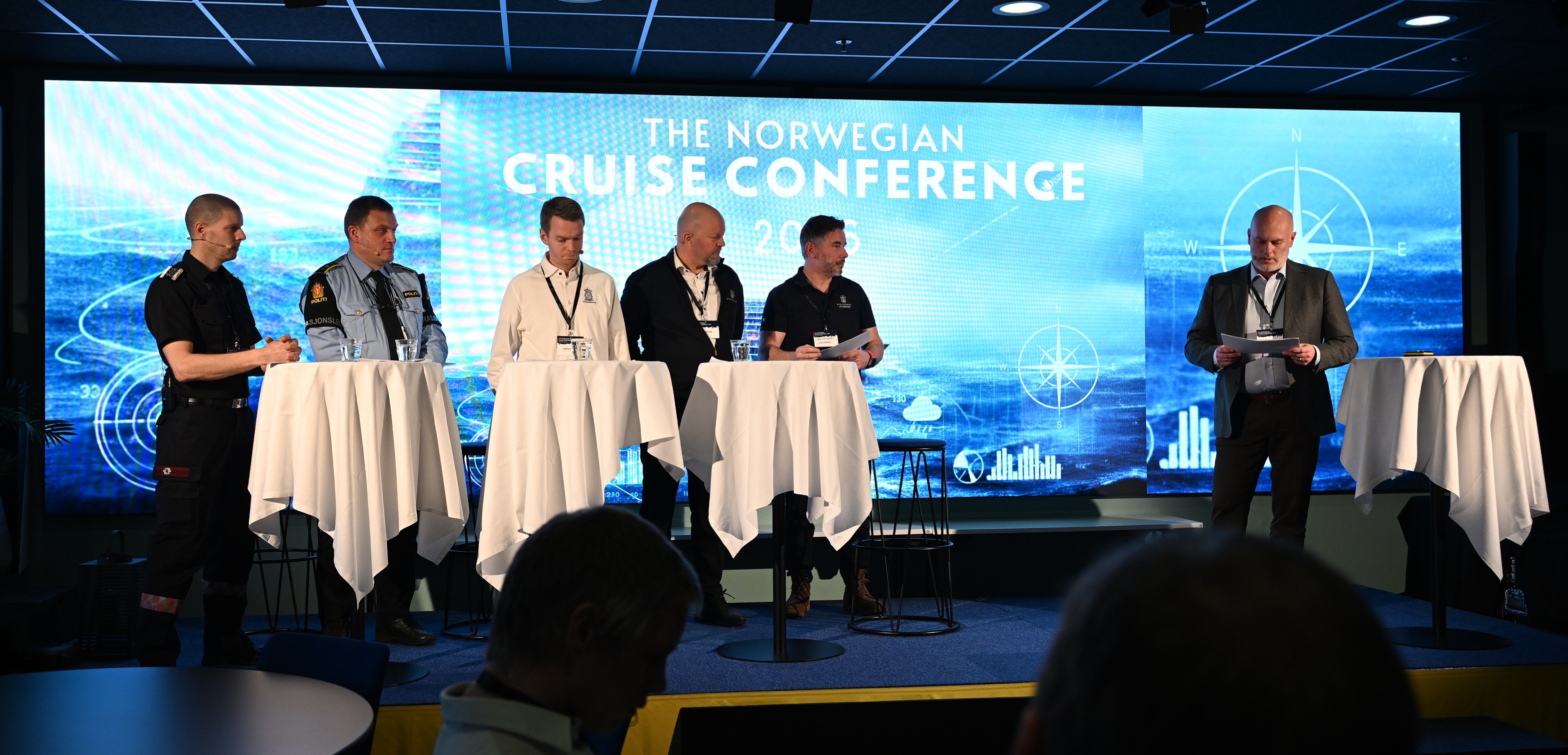 Last ned panelet_mindre.jpgFagmyndigheter bidro med sine perspektiver, roller og planer. Fra venstre: Sindre Egeness – brannsjef Ålesund/ med i Maritime rescue operations with special fire brigade teams, Eivind Klokkersund – operasjonsleder Sunnmøre politidistrikt, Andreas Ingsøy –redningsleder Hovedredningssentralen (HRS), Tormod Våga – Leder Kvitsøy VTS og representant fra kollektiv redningsledelse hos HRS S., Geir Pettersen – los fra Kystverket, trafikkleder Trond Langemyr fra Vardø Vessel Traffic Service (NOR VTS) ledet av Kjetil Aasebø fra Kystverket.