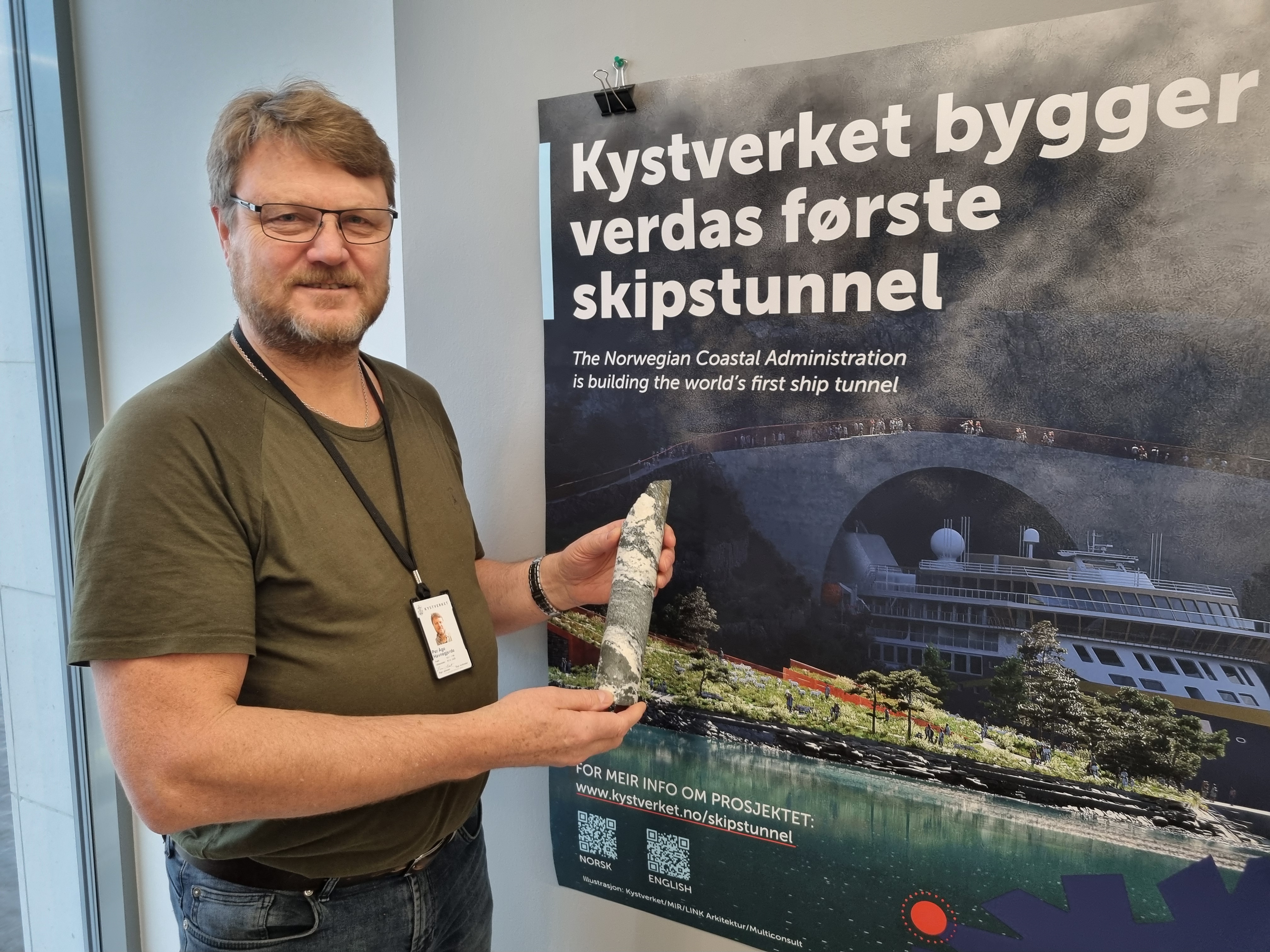 Anleggssjef for Stad skipstunnel, Per åge Havnegjerde, med en kjerneprøve fra traseen til Stad skipstunnel. Prøvene gir nyttig informasjon om fjellkvalitet og grunnforhold for den kommende skipstunnelen.