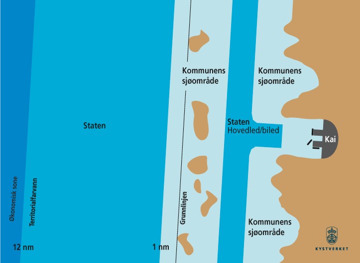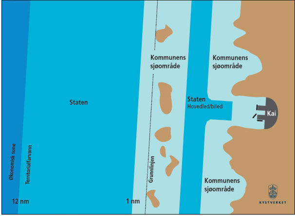Illustrasjon av myndighetsfordelingen mellom kommune og stat gitt av farledsforskriften
