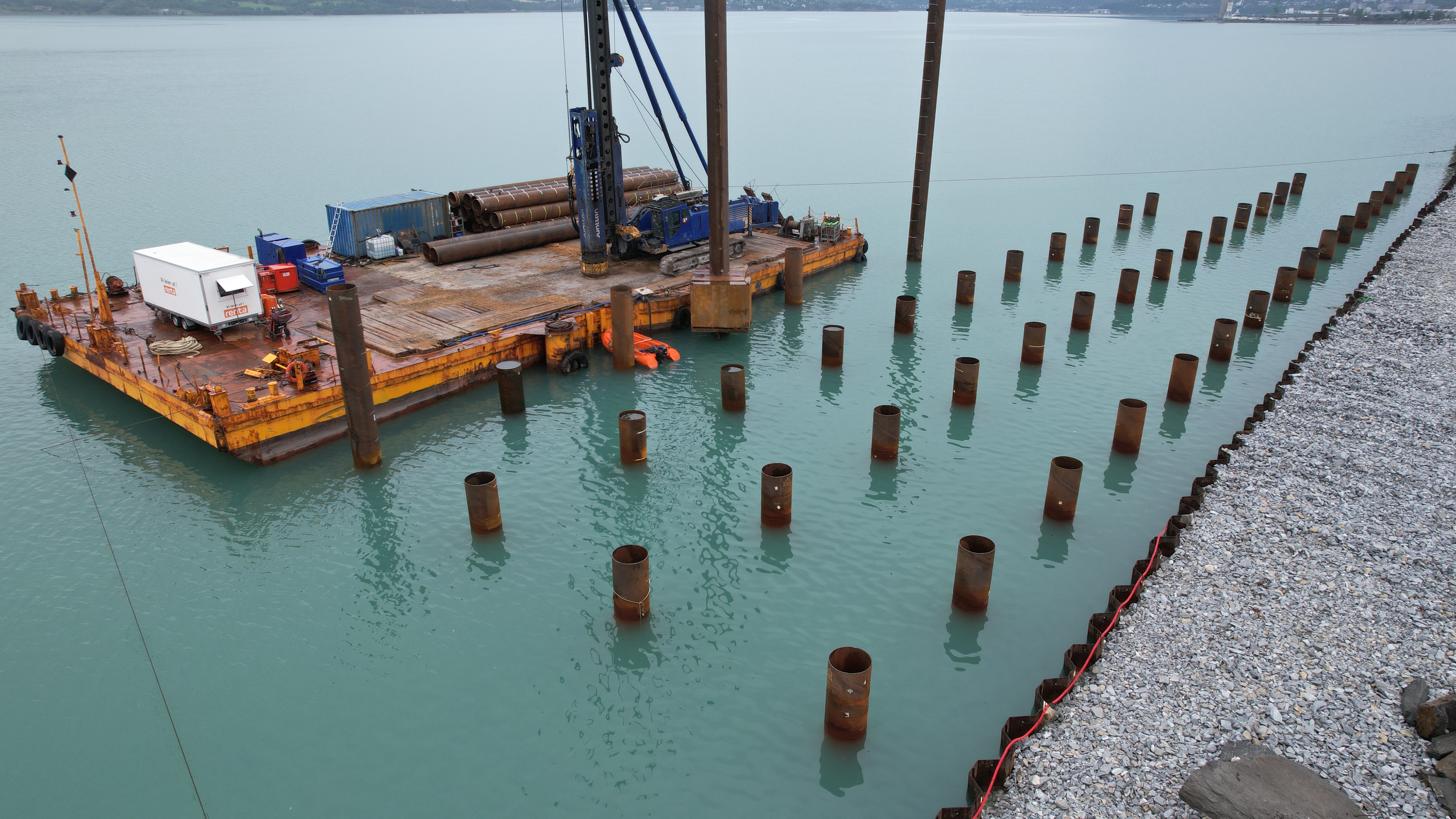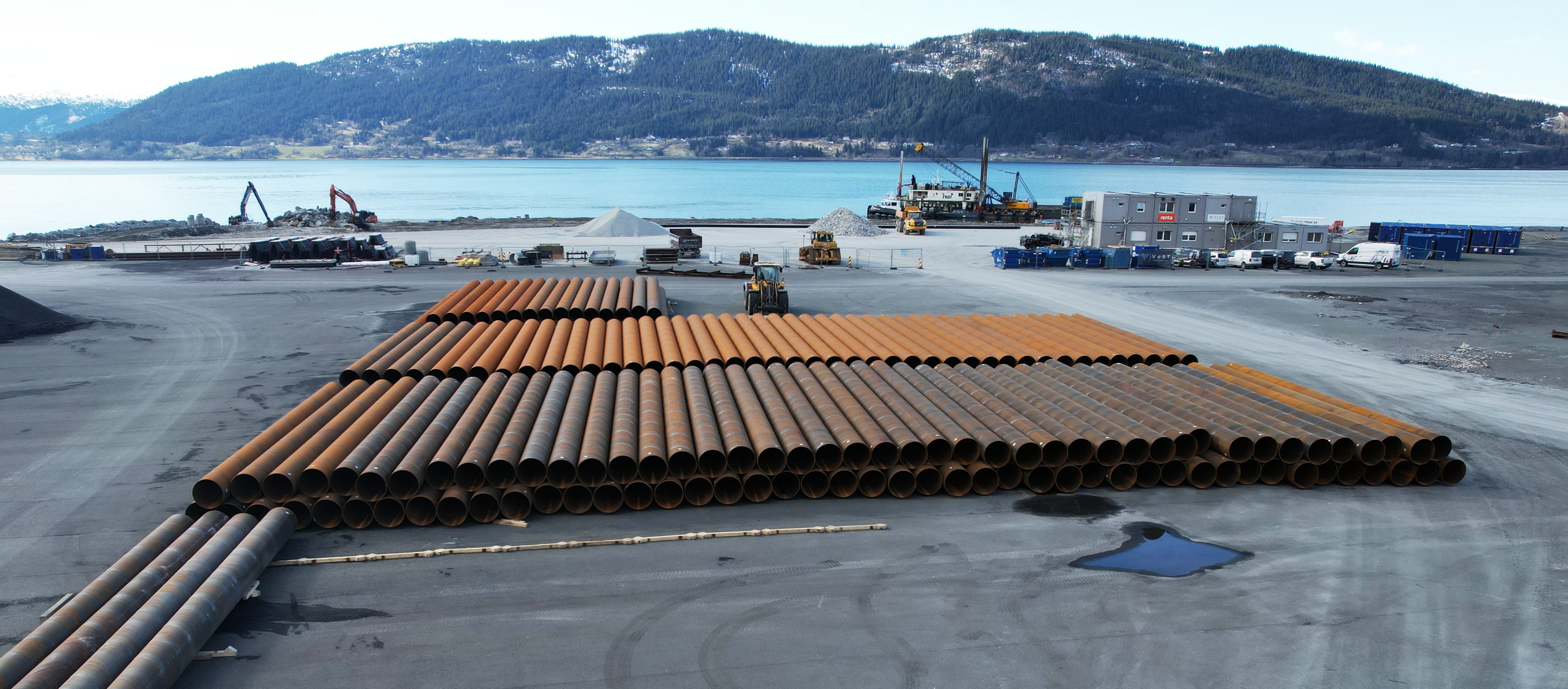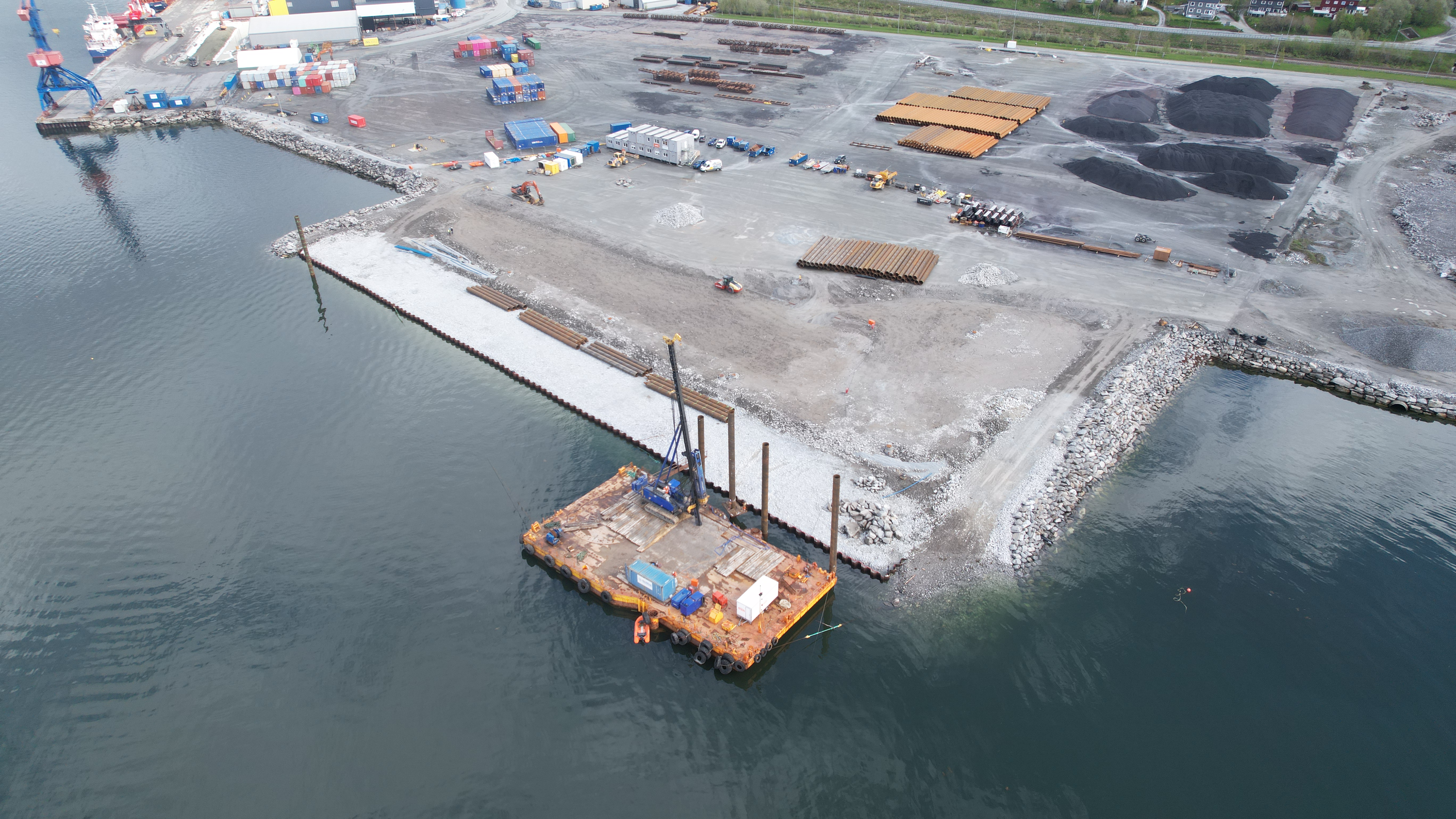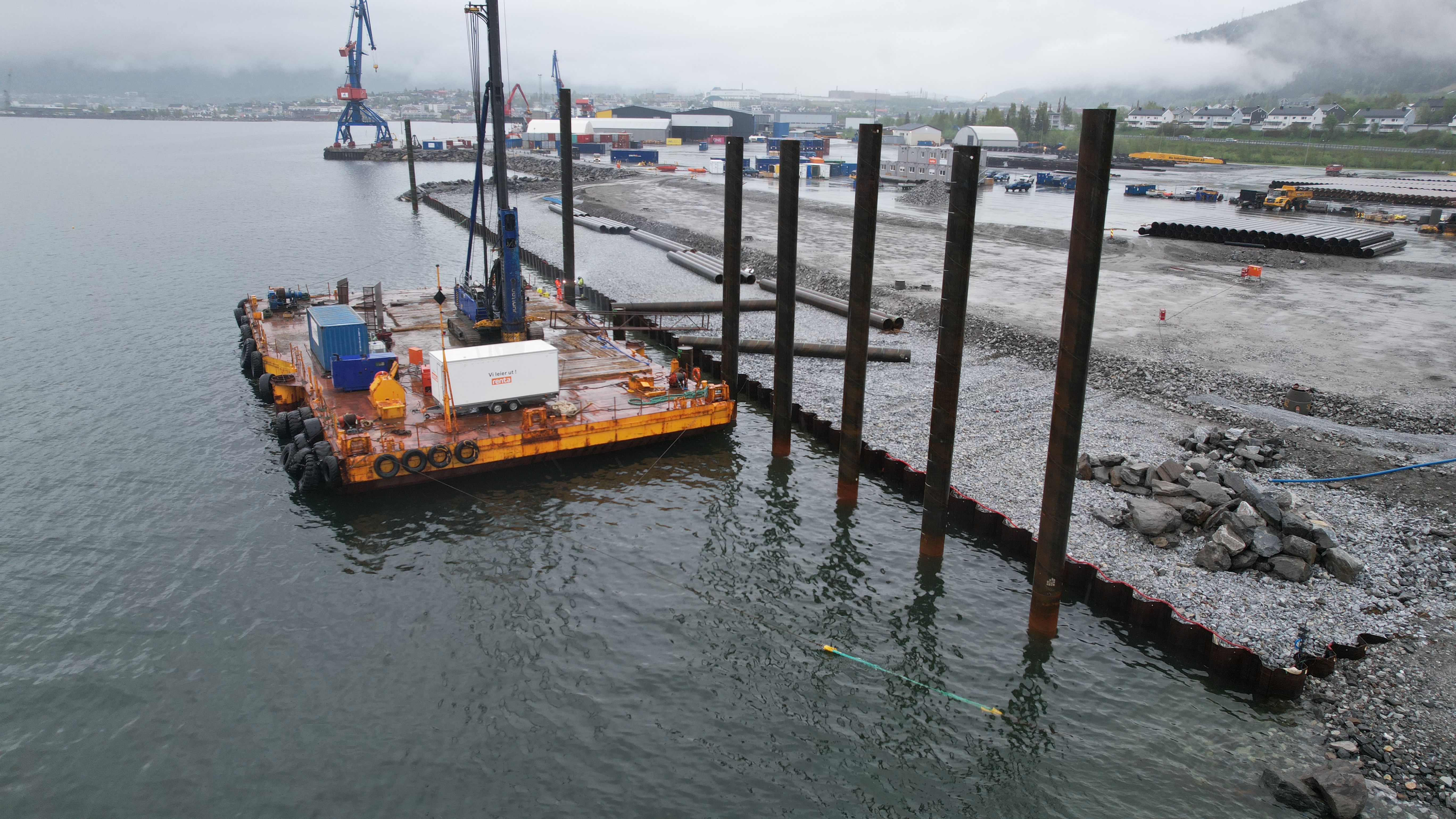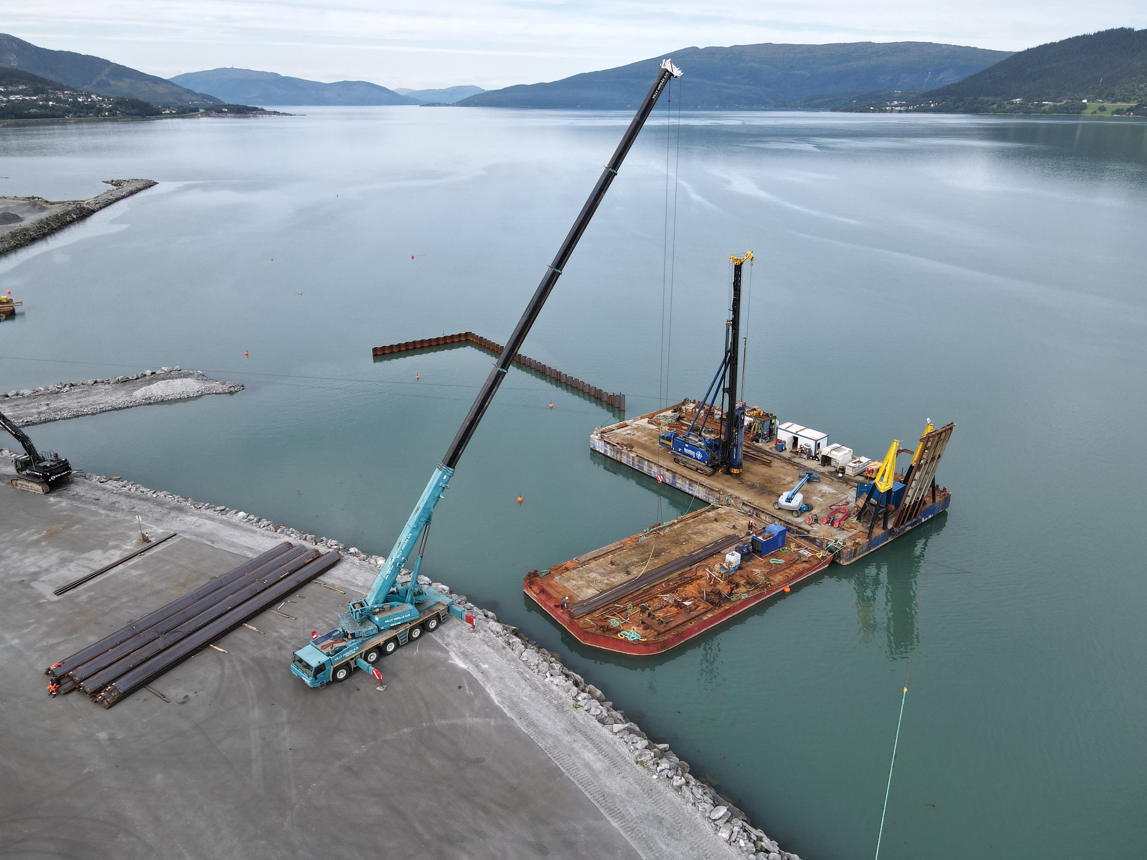 Fundamenteringen av dypvannskaia starter med nedramming av store stålrørspeler – hver er rundt 50 meter lang og én meter i diameter. Bilde fra april, 2025.