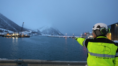 Mudringsarbeid i havnaI de få lyse timene nå i mørketida fikk vi et glimt av denne vakre og værutsatte plassen – og rakk å se fjell, fjord og anleggsområdet da regnet stilnet og vinden rev skydekket til side.